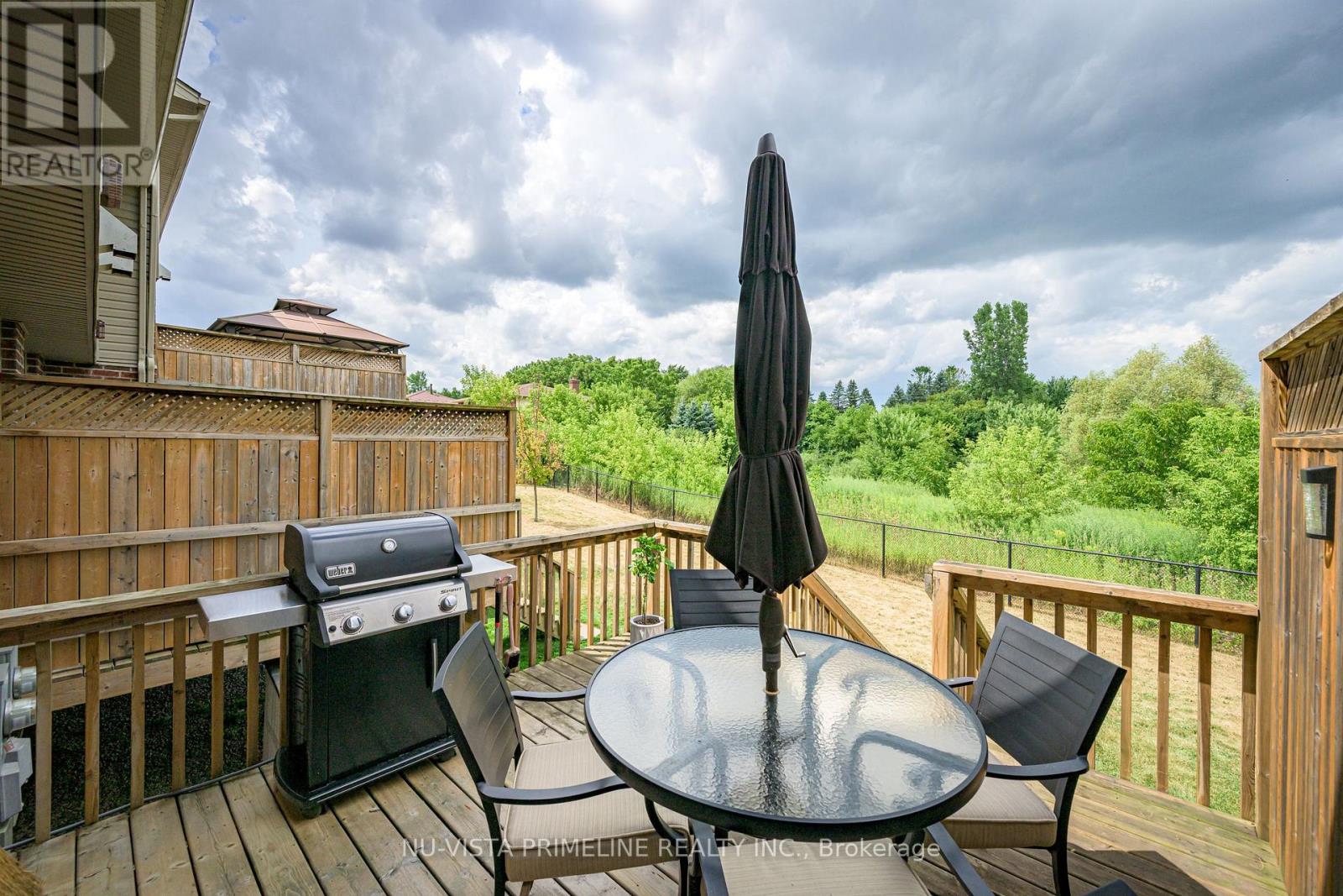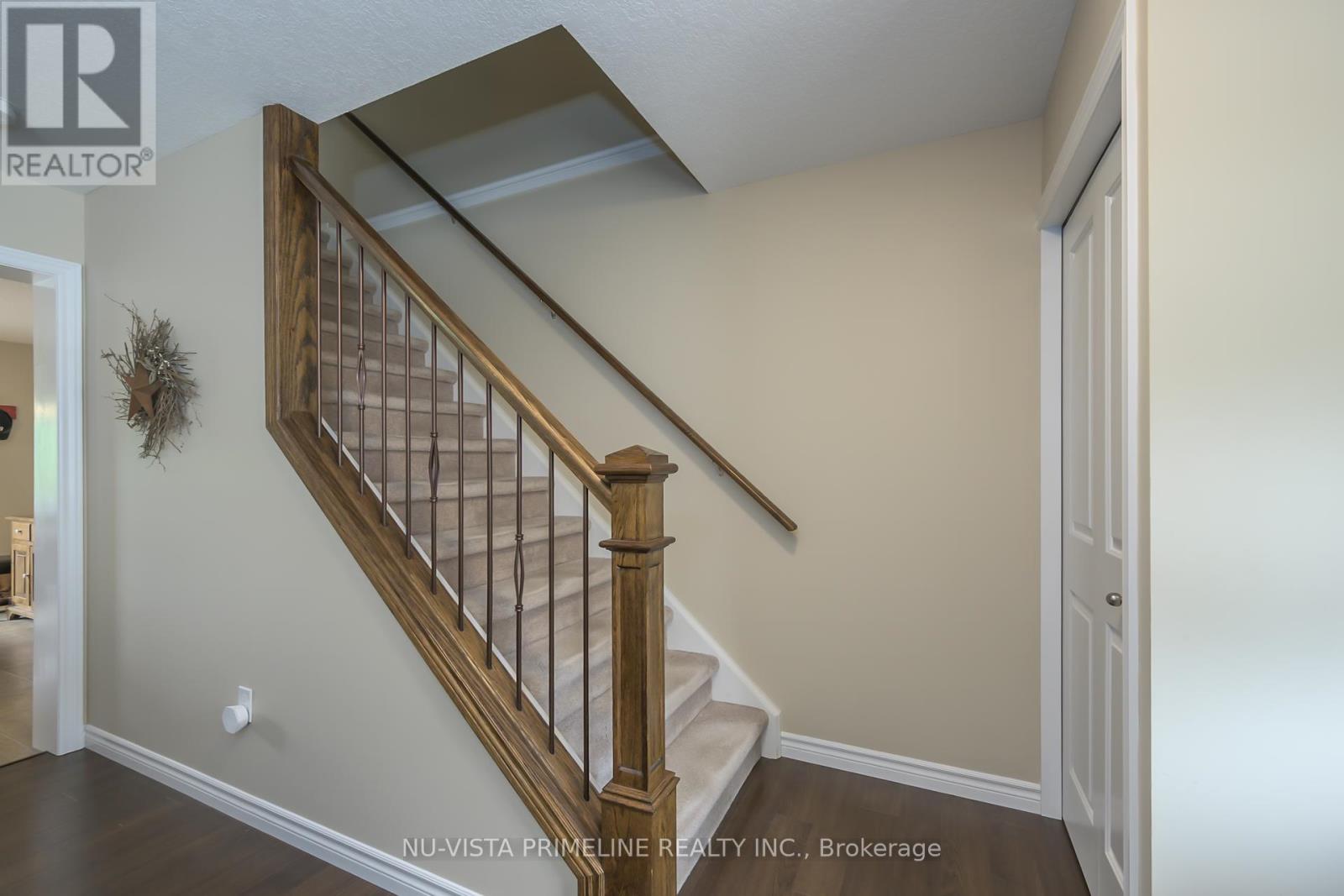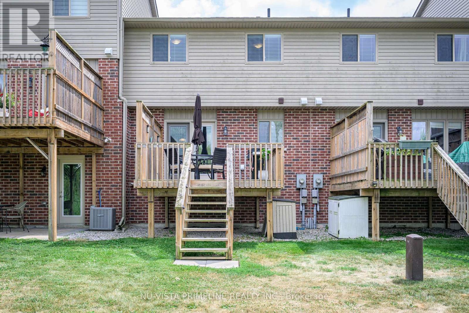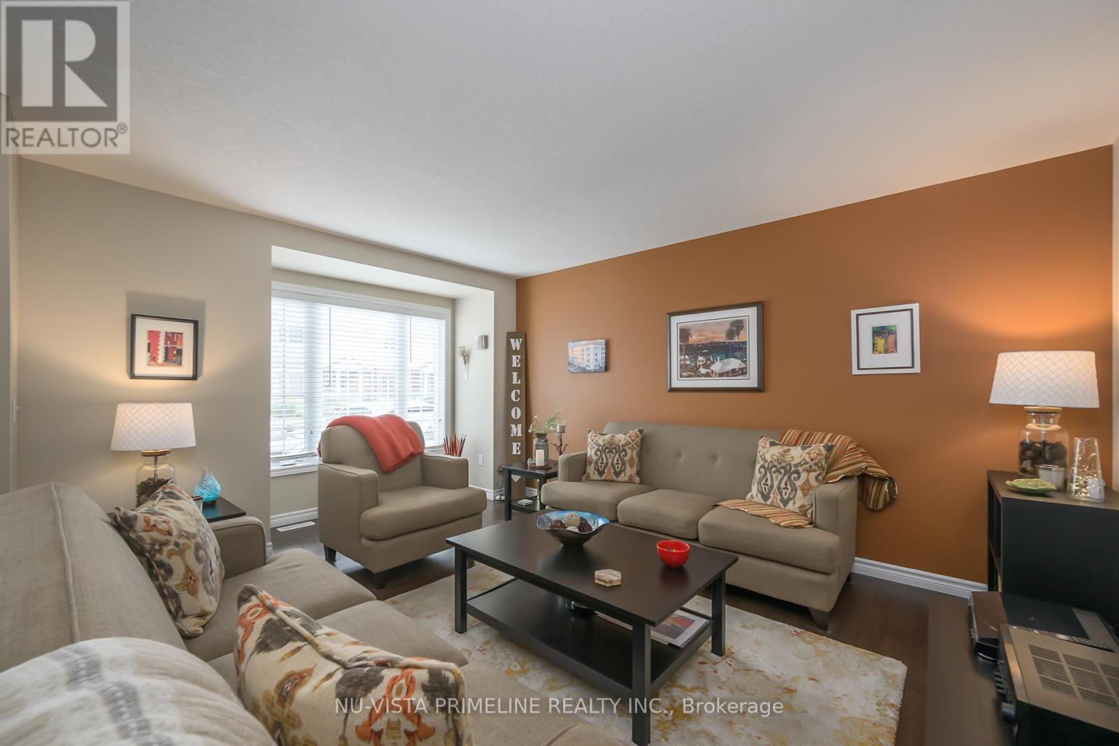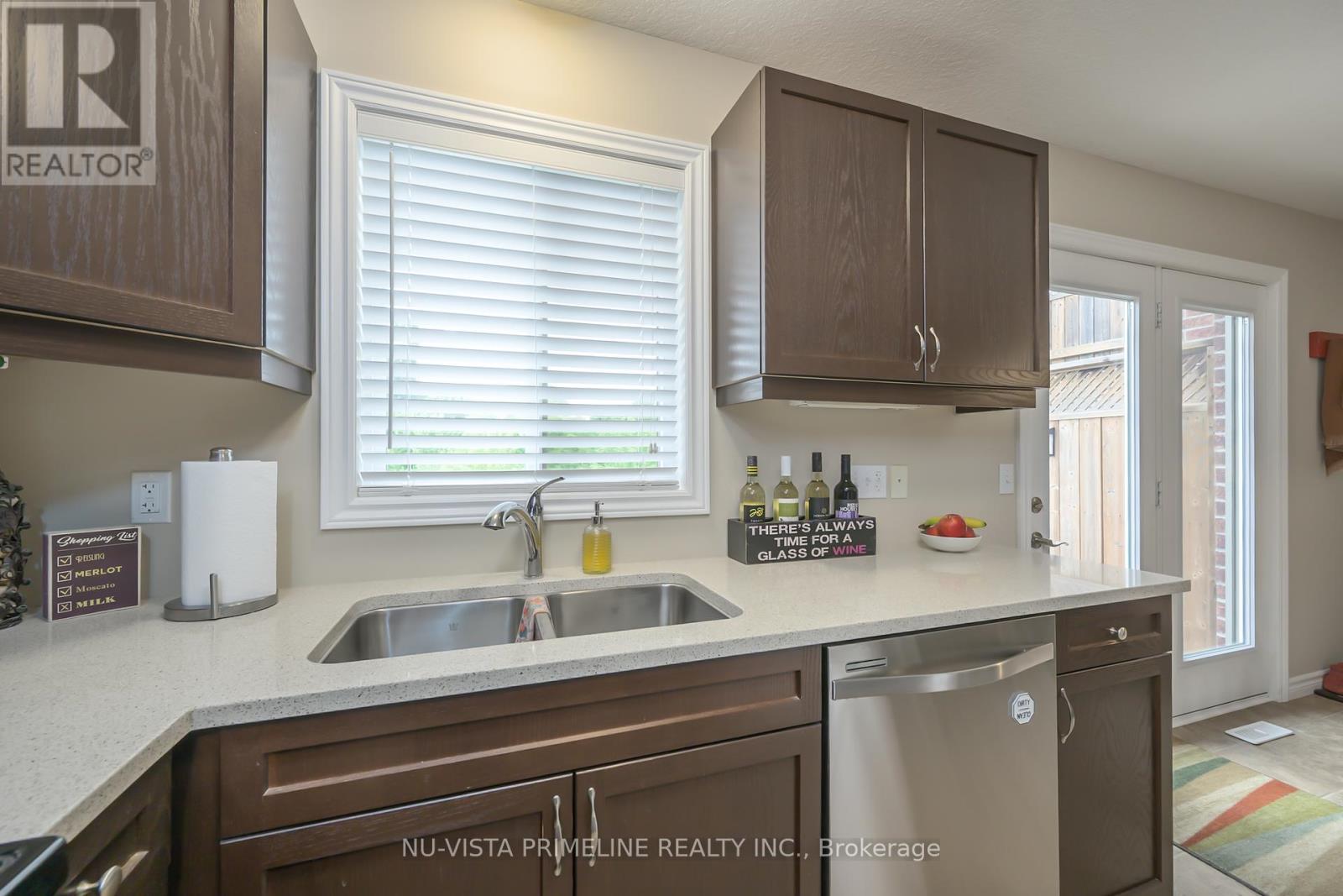 Ideally located in North London's Jacob's Ridge development, this spotless home backs onto a conservation area/RAVINE and walking trails. Enjoy views of the Stoney Creek Valley from your very own deck! Close to Western U, Fanshawe College and top-rated schools such as Stoney Creek Public School and Lucas Secondary School. The beautifully finished interior features laminate flooring in foyer and living room, vinyl and carpet thru out, complemented by a wood and wrought iron banister and railing. The entire unit has been freshly painted in a light, neutral tone. The kitchen boasts quartz countertops, double sinks, under cabinet lighting and plenty of cupboards. A south facing window in the large living area lets natural light flood into the space. Garden doors from the kitchen lead to a private deck offering a peaceful ravine view. Enjoy the convenience of a powder room on the main floor . Upstairs there are three bedrooms. The spacious primary bedroom has a very generous walk-in closet. The pristine main bath has a tub and shower, built-in shelving and a vanity for plenty of storage. Fresh wall-to-wall carpeting adds warmth and comfort to the bright, lower-level family room. Laundry is also on this level as well as rough-in plumbing for a third bathroom. There is plenty of storage too. Attractive stone and brick exterior. Two exclusive use parking spaces are right in front of the unit and there is plenty of visitor parking too. Natural Gas line with Weber BBQ included . Condo fee only $284.00/month. Quality built by Rembrandt Homes. Don't miss out on this lovely move-in ready townhouse. Book your showing today! (id:4069)